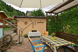 - Sitzecke am Haus mit Tisch, Stühlen, Bank, Relaxstühle, Feuertonne und Grill für gesellige Abende am Feuer |