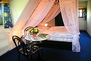 - 1 Schlafzimmer mit Doppelbett - Erntewagen, Aufbettung möglich, großer Schrank, Bettwäsche inklusive - 1 Schlafzimmer mit Doppelbett - Himmelbett, Aufbettung möglich, großer Schrank, Bettwäsche inklusive |