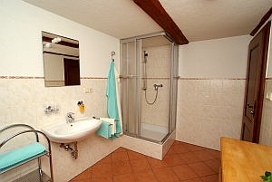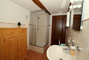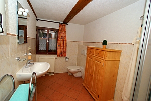 - 1 Badezimmer mit Dusche und WC, Schrank und Fön |