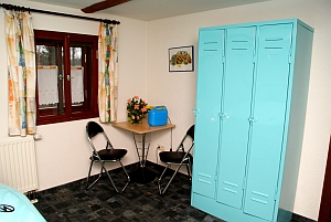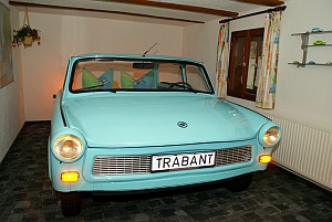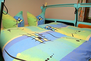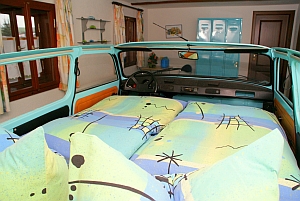 - 1 Schlafzimmer mit Trabbi - Doppelbett blau, Liegefläche 1,70 x 2,00 m, großer Kleiderschrank |