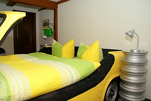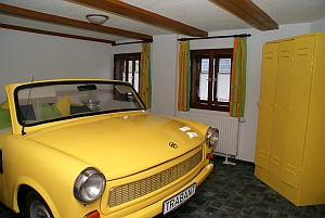 - 1 Schlafzimmer mit Trabbi - Doppelbett gelb, Liegefläche 1,70 m x 2,00 m, großer Kleiderschrank |