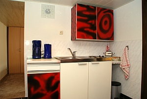 - 1 Küche mit Singleküche Herd 2 Platten, Kühlschrank mit Gefrierfach, Wasserkocher und Kaffeemaschine |