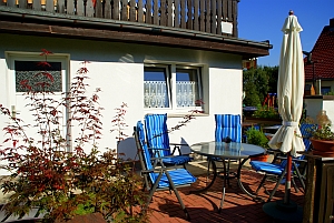 - gemütliche Sitzecke im Freien mit Tisch, Stühlen, Sonnenschirm und Sonnenliege, Grill auf Wunsch |