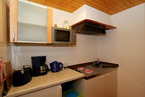 - kleine Küche vom Wohnzimmer aus mit Herd 2 Platten, Mikrowelle,
