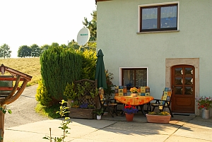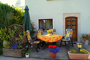- gemütliche Sitzecke vor der Ferienwohnung umgeben von vielen schönen Blumen - Tisch, 4 Stühle, Grill auf Wunsch, Haustiere auf Anfrage