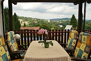 - überdachte Sitzecke mit Sonnenmarkise mit Tisch und 4 Stühlen mit wunderschönen Blick auf Sebnitz |