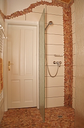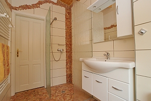 - komfortable Dusche mit WC, Spiegelschrank und Fön |