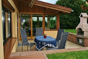 - Sitzecke mit Sonnenmarkise mit Tisch und 4 Stühlen - feststehender Grill für gemütliche Grillabende |