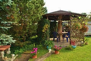 | - überdachter Pavillion mit Tisch und Stühlen im schönen Garten mit vielen Blumen |